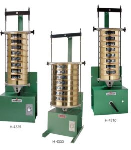 Easy front loading and unloading of sieves. Capacity: 10 or less full height US Standard 8″ diameter sieves with pan and cover. Adapter for 3″ and 5″ sieves included.