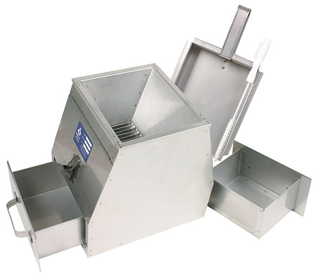 Rapid even splitting of samples is accomplished by pouring a sample into the hopper from which it is divided by riffles into two equal parts by a series of chutes and discharged into two pans. Prices include galvanized iron pans, scoop and cleaning brush. Stainless steel construction.
